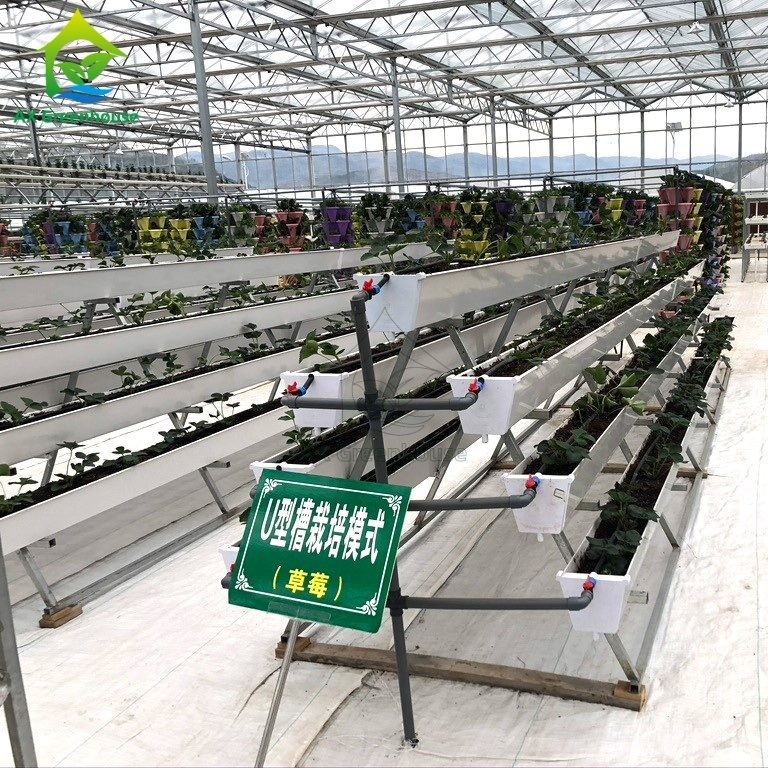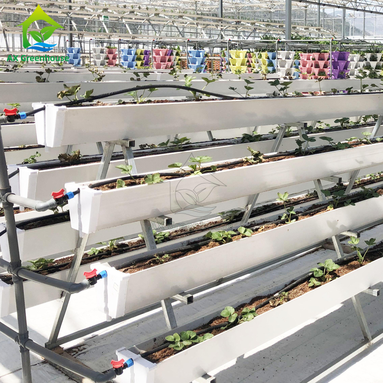 Os vales de plantação de estrutura A são usados principalmente para o plantio de morangos.3 a 4 camadas de calhas de cultivo são instaladas nos lados esquerdo e direito do quadro de cultivo, e o espaçamento entre as camadas é de cerca de 40 cm. As caldeiras de plantio são geralmente feitas de matérias-primas de pvc.e o fundo é projetado com uma vala de drenagem para facilitar a drenagem do excesso de água.